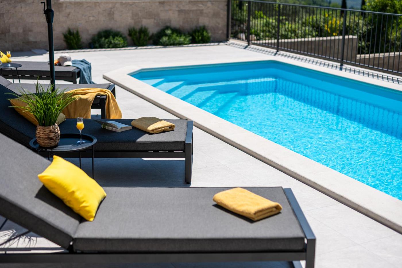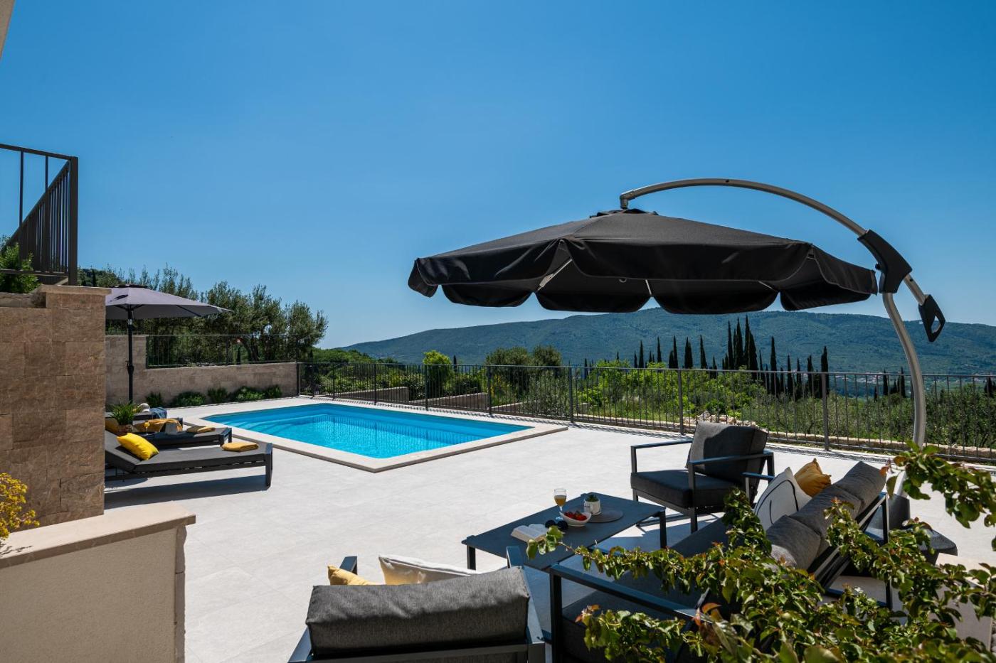 Three-Bedroom Villa. This villas special features are the pool with a view and the hot tub. Offering free toiletries, this villa includes a shared bathroom with a walk-in shower, a bath or a shower and a hairdryer. Guests will find a stovetop, a refrigerator, a dishwasher and kitchenware in the fully equipped kitchen. The villa also has a barbecue. The spacious air-conditioned villa offers a flat-screen TV with streaming services, a washing machine, a private entrance, soundproof walls as well as sea views. The unit offers 5 beds.