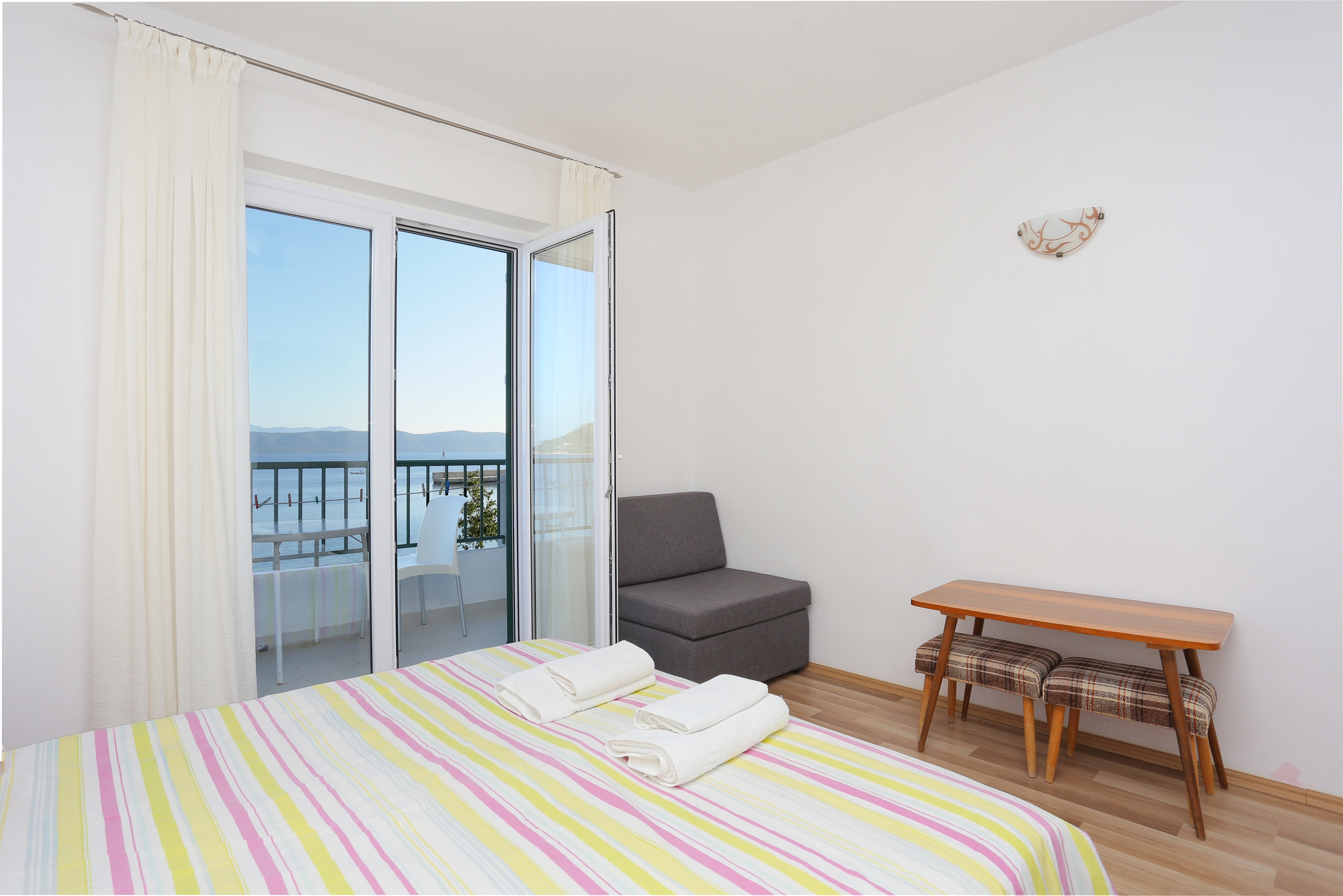 Apartment can accommodate 7 guests. Beds are situated in 3 sleeping rooms, within 71m2. Guests can use a private terrace to enjoy the warm summer evenings. The apartment offers the sea view. For full enjoyment and relaxation there is a private barbecue for this accommodation guests only. Notthe rooms of the booked accommodation unit are connectedone whole. Some of the rooms of the accommodation unit are not connected with the rest of the unit. INCLUDED IN THE PRICE: tourist tax, final cleaning, air-conditioning, parking, internet, baby cot. OBLIGATORY ADDITIONAL COSTS: short stay fee (surcharge depending on a number of booked nights: 30% - 1, 20% - 2, 10% - 3). The availability of additional services for your chosen dates of stay, as well as their prices (if none are listed) must be checked ahead of time. Any additional services not shown in the price calculation are payable directly to the property owner and only if used by the visitor.