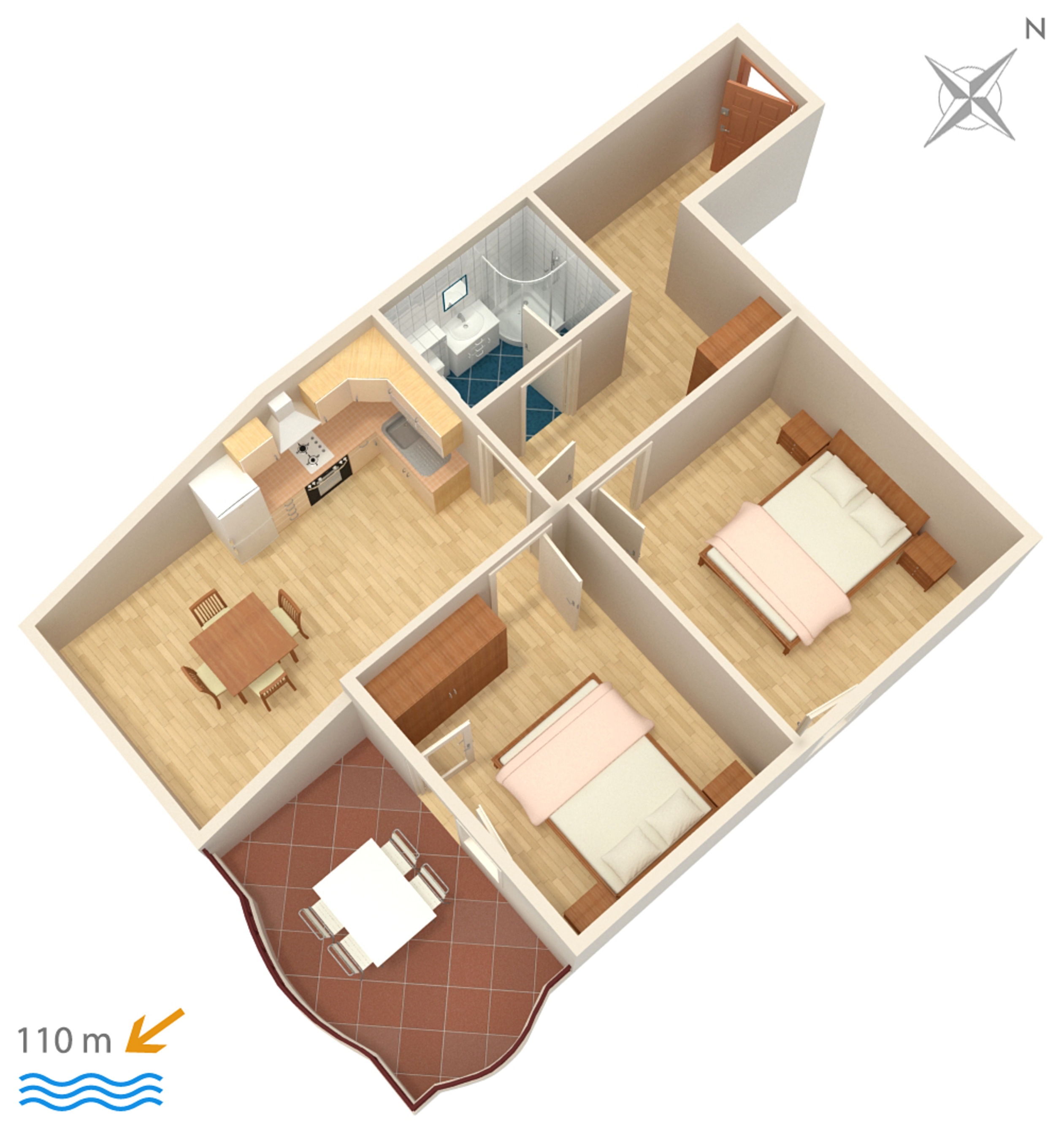 Apartment can accommodate 4 guests. Beds are situated in 2 sleeping rooms, within 53m2. Guests can use a private balcony to enjoy the warm summer evenings. The apartment offers the sea view. INCLUDED IN THE PRICE: tourist tax, final cleaning, air-conditioning, parking, garage, internet, iron, ironing board, hairdryer. OPTIONAL ADDITIONAL COSTS: laundry (€10.00 washing), additional bed (€15.00 per night). The availability of additional services for your chosen dates of stay, as well as their prices (if none are listed) must be checked ahead of time. Any additional services not shown in the price calculation are payable directly to the property owner and only if used by the visitor.