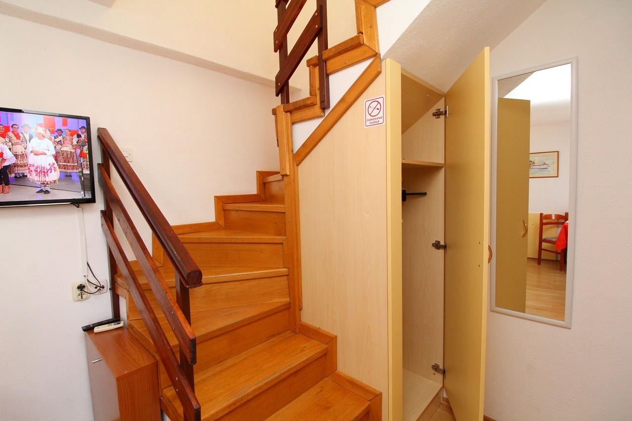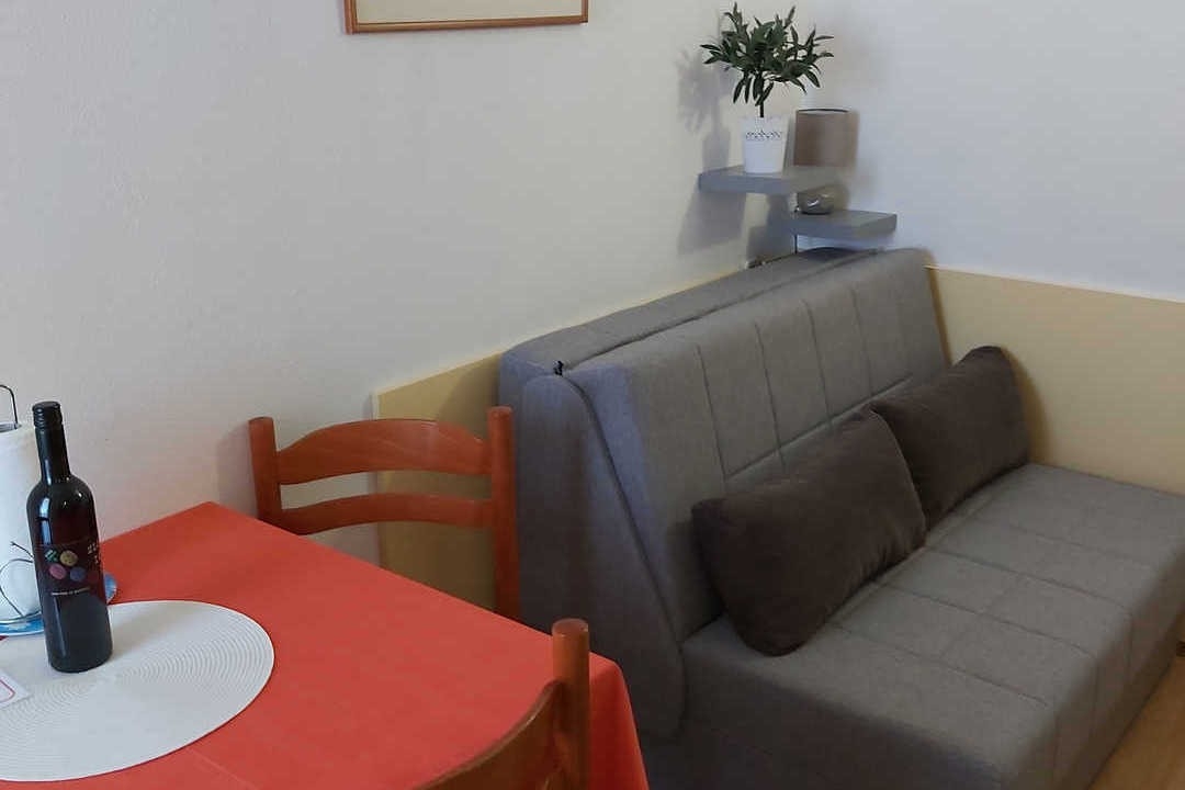 Apartment can accommodate 4 guests. Beds are situated in 1 sleeping rooms, but also in the living room, within 33m2. Guests can use a private terrace to enjoy the warm summer evenings. Food can be prepared using barbecue which is shared with other guests too. INCLUDED IN THE PRICE: tourist tax, final cleaning, air-conditioning, parking, internet, baby cot, iron, ironing board, hairdryer. OPTIONAL ADDITIONAL COSTS: additional bed (€10.00 per night). The availability of additional services for your chosen dates of stay, as well as their prices (if none are listed) must be checked ahead of time. Any additional services not shown in the price calculation are payable directly to the property owner and only if used by the visitor.