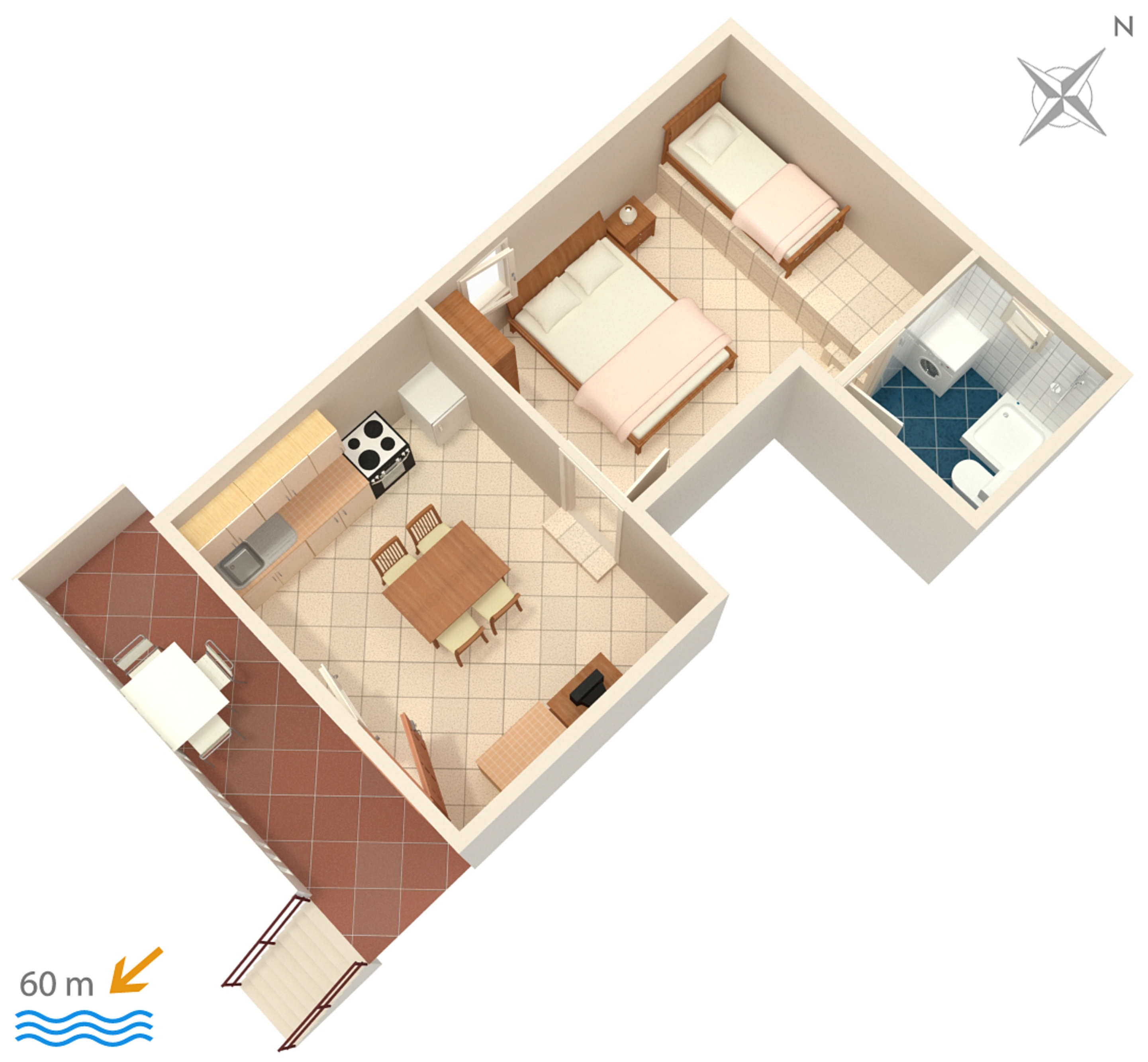 Apartment can accommodate 2 guests. Beds are situated in 1 sleeping rooms, within 33m2. Guests can use a private terrace to enjoy the warm summer evenings. The apartment offers the sea view. INCLUDED IN THE PRICE: tourist tax, final cleaning, parking, internet. OBLIGATORY ADDITIONAL COSTS: short stay fee (surcharge depending on a number of booked nights: 30% - 1, 20% - 2, 10% - 3). OPTIONAL ADDITIONAL COSTS: laundry (€5.00 washing). The availability of additional services for your chosen dates of stay, as well as their prices (if none are listed) must be checked ahead of time. Any additional services not shown in the price calculation are payable directly to the property owner and only if used by the visitor.