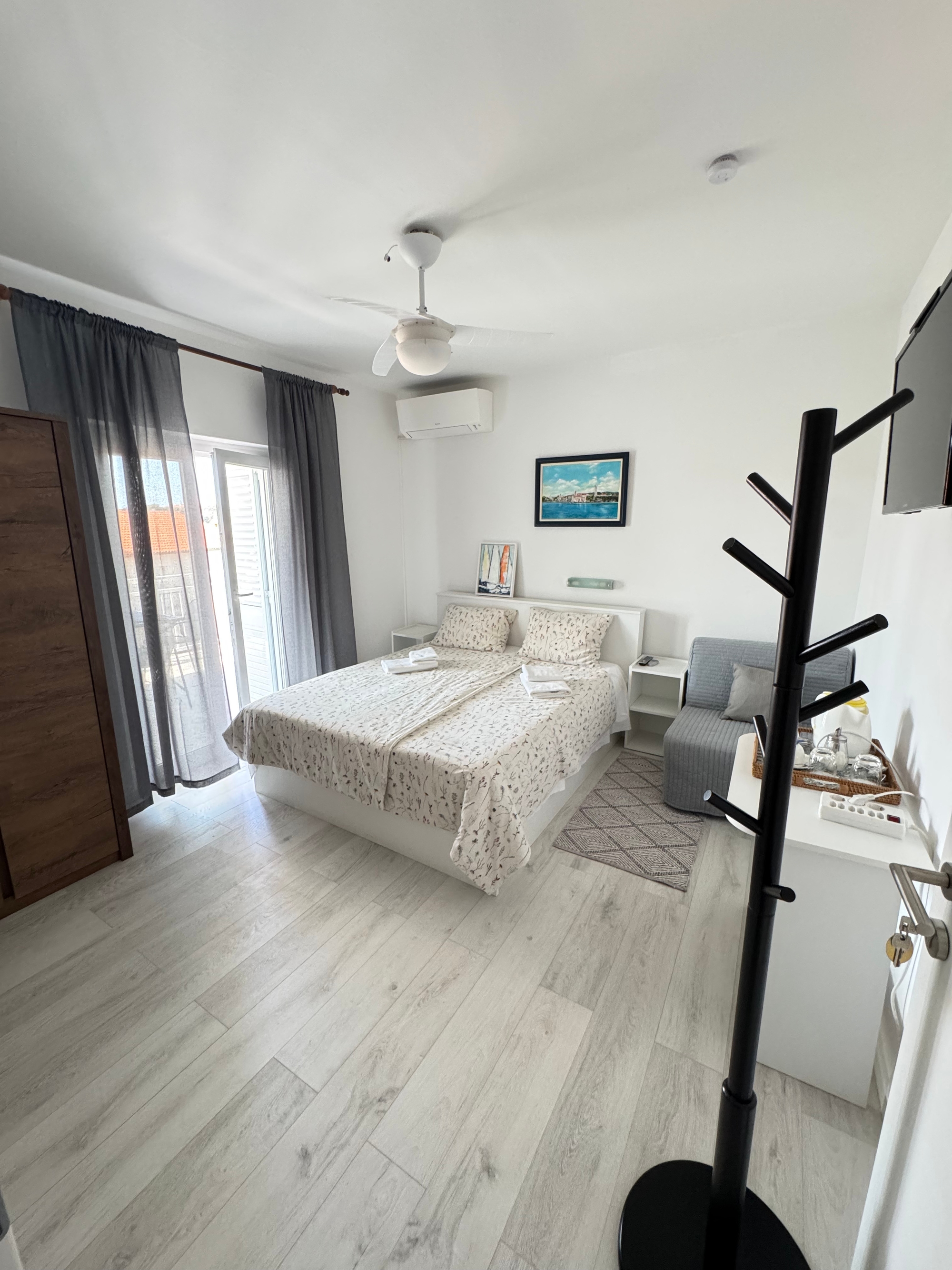 Room can accommodate 2 guests. Beds are situated in 1 sleeping rooms, within 17m2. Guests can use a private terrace to enjoy the warm summer evenings. The room offers the sea view. Reserved accommodation unit is a room with its own bathroom and there is no usage of kitchen. INCLUDED IN THE PRICE: tourist tax, final cleaning, air-conditioning, parking, internet, hairdryer. OPTIONAL ADDITIONAL COSTS: 1 bed for children (€15.00 personnight). The availability of additional services for your chosen dates of stay, as well as their prices (if none are listed) must be checked ahead of time. Any additional services not shown in the price calculation are payable directly to the property owner and only if used by the visitor. Discounts to the base price: free day 14=13 (for reservations of 14 or more days you get one free day for the stay until 31122026).