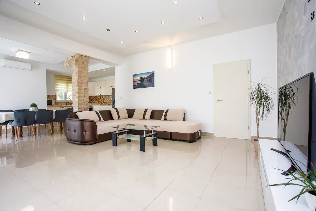 House can accommodate 10 guests. Beds are situated in 3 sleeping rooms, but also in the living room, within 190m2. Guests can use a private terrace to enjoy the warm summer evenings. For full enjoyment and relaxation there is a private barbecue for this accommodation guests only. During stay, there is a private pool for relaxation and pleasure. INCLUDED IN THE PRICE: tourist tax, final cleaning, air-conditioning, pool, parking, internet, bicycle, baby cot, iron, ironing board, hairdryer, sunshade, sunchairs. OBLIGATORY ADDITIONAL COSTS: short stay fee (surcharge depending on a number of booked nights: 30% - 1, 20% - 2, 10% - 3). The availability of additional services for your chosen dates of stay, as well as their prices (if none are listed) must be checked ahead of time. Any additional services not shown in the price calculation are payable directly to the property owner and only if used by the visitor. Discounts to the base price: free day 21=19 (for reservations of 21 or more days you get 2 free days for the stay until 31122026).