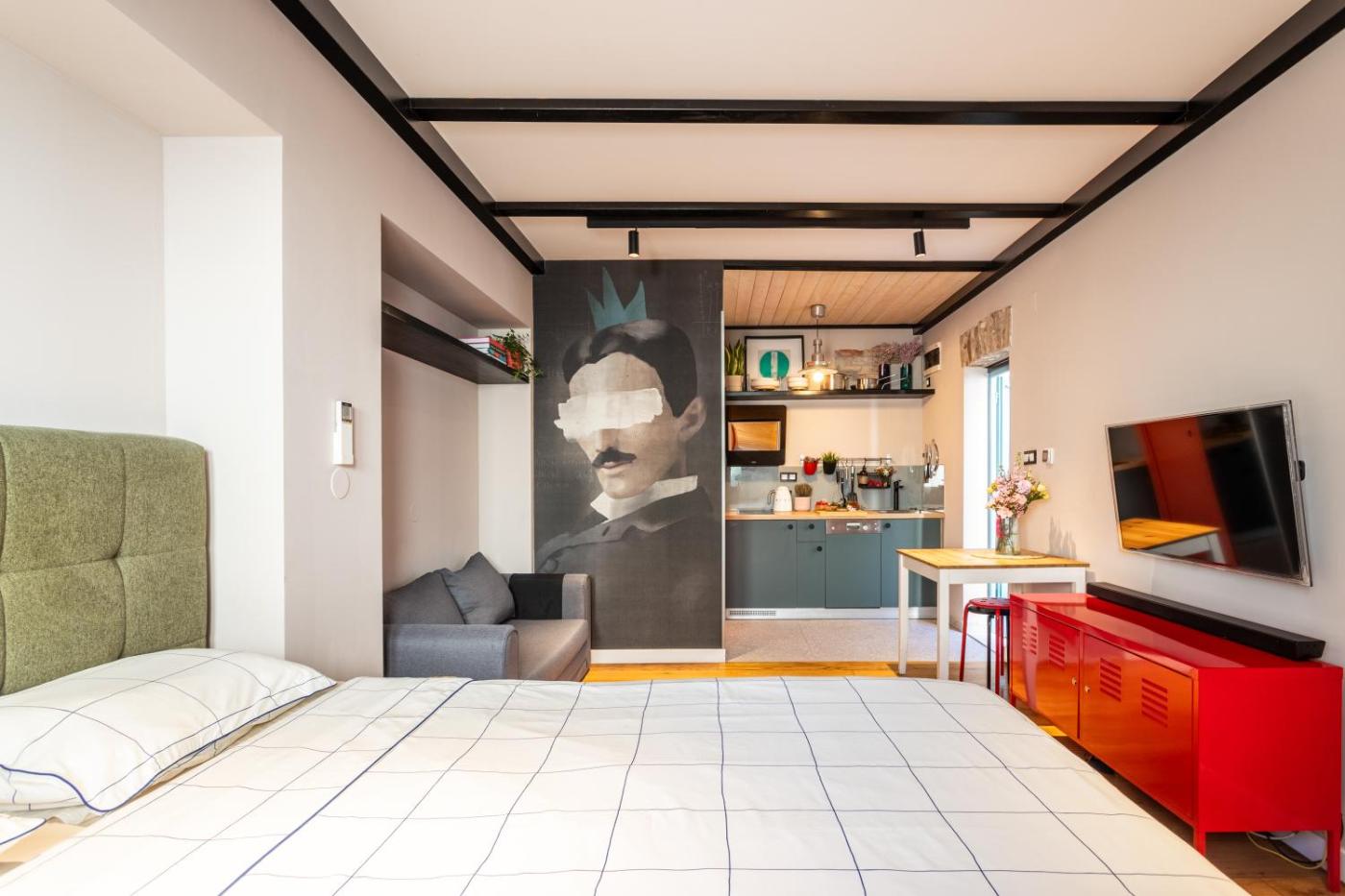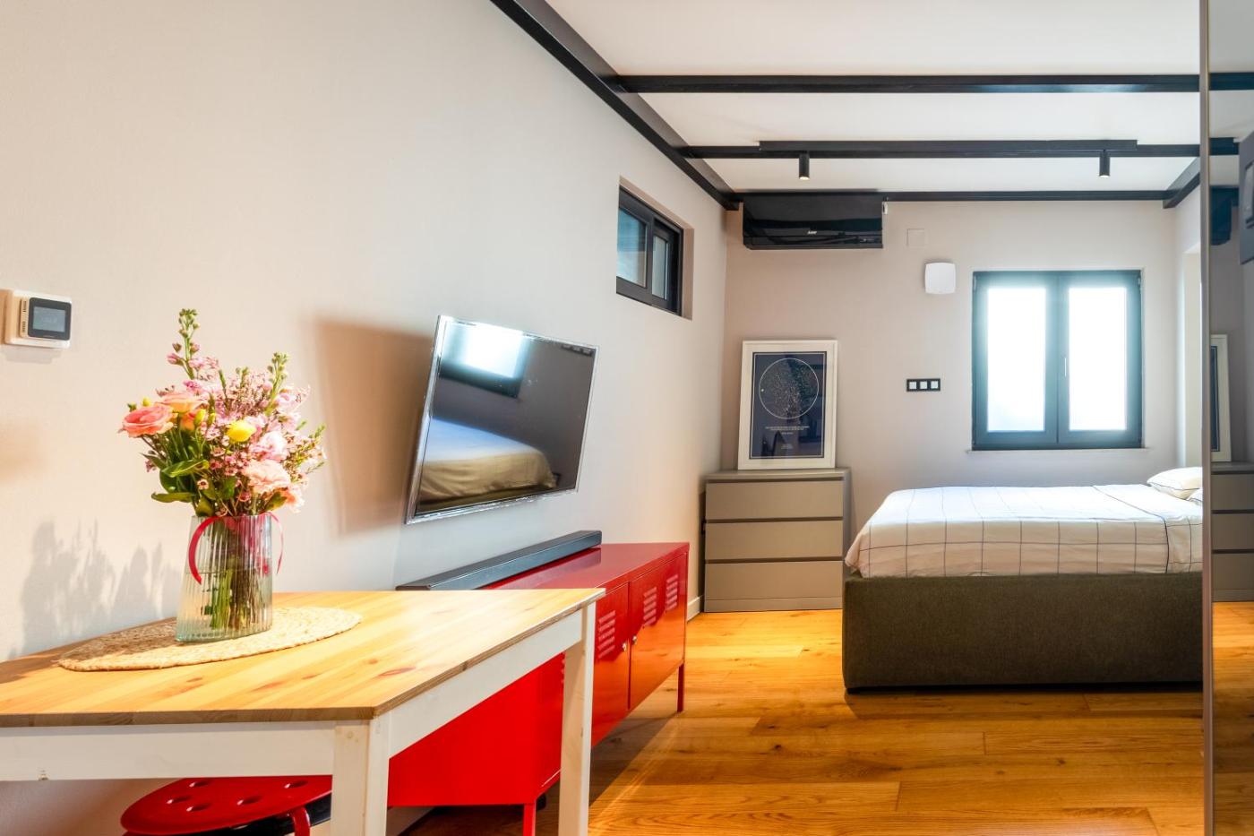 Studio Apartment. Featuring a private entrance, this air-conditioned apartment is comprised of a kitchen, 1 bedroom and 1 bathroom with a shower and a hairdryer. In the fully equipped kitchen, guests will find a stovetop, a refrigerator, a dishwasher and kitchenware. Boasting a patio, this apartment also offers a washing machine, a seating area and a flat-screen TV with cable channels. The unit offers 1 bed.