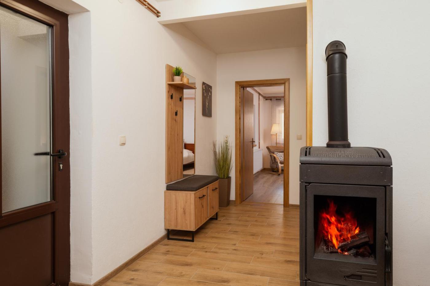 Two-Bedroom Apartment. This apartments special feature is the fireplace. This spacious apartment consists of 1 living room, 2 separate bedrooms and 1 bathroom with a bath and bathrobes. Guests can make meals in the kitchen that is equipped with a refrigerator, a dishwasher, kitchenware and an oven. The apartment provides a flat-screen TV with cable channels, a washing machine, a private entrance, soundproof walls as well as mountain views. The unit offers 5 beds.