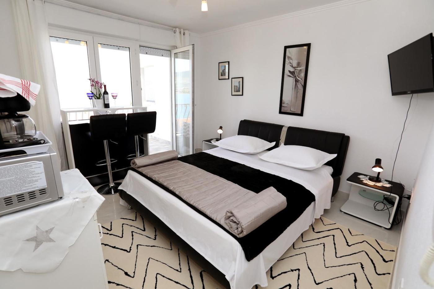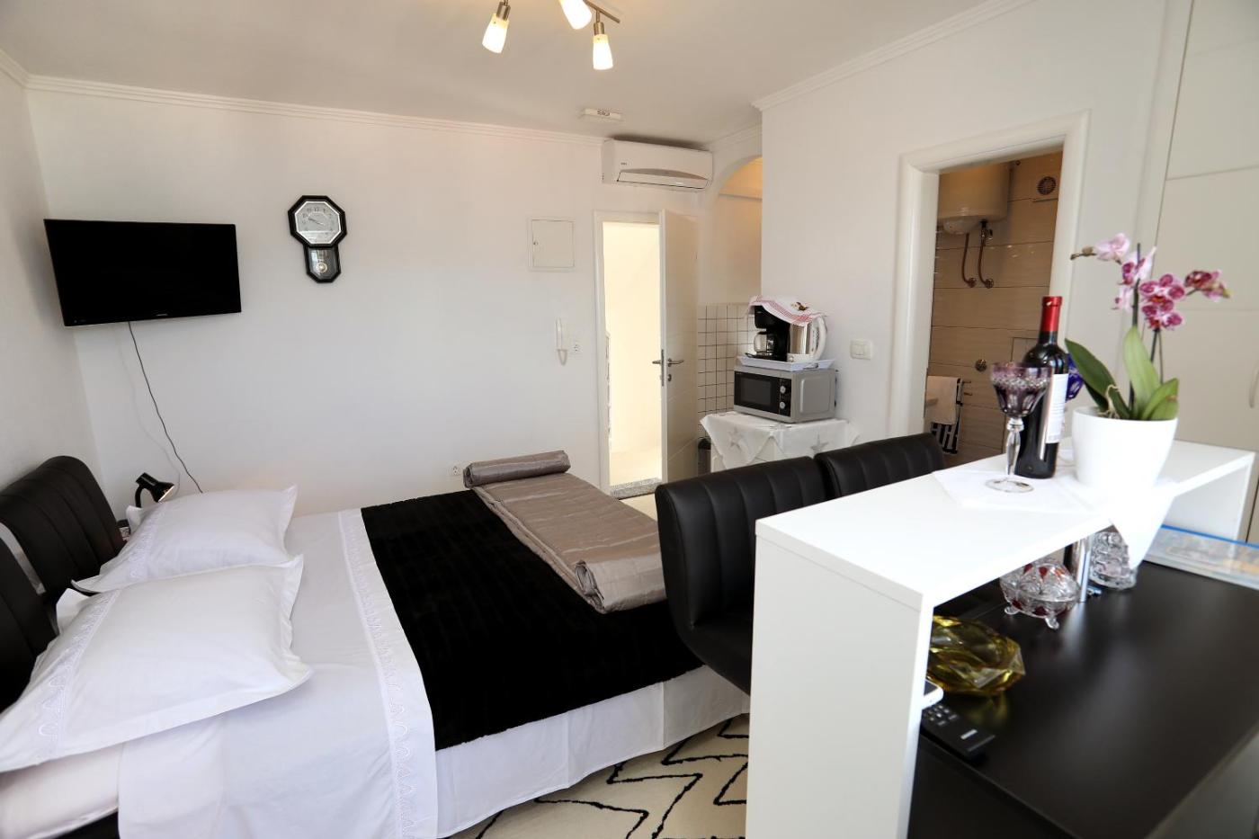 Studio Apartment. Boasting a private entrance, this air-conditioned apartment comes with a kitchenette, 1 bedroom and 1 bathroom with a shower and a hairdryer. Guests will find a stovetop, a refrigerator, kitchenware and a microwave in the kitchenette. The apartment also includes a barbecue. Featuring a terrace with sea views, this apartment also features a washing machine and a flat-screen TV with cable channels. The unit has 1 bed.