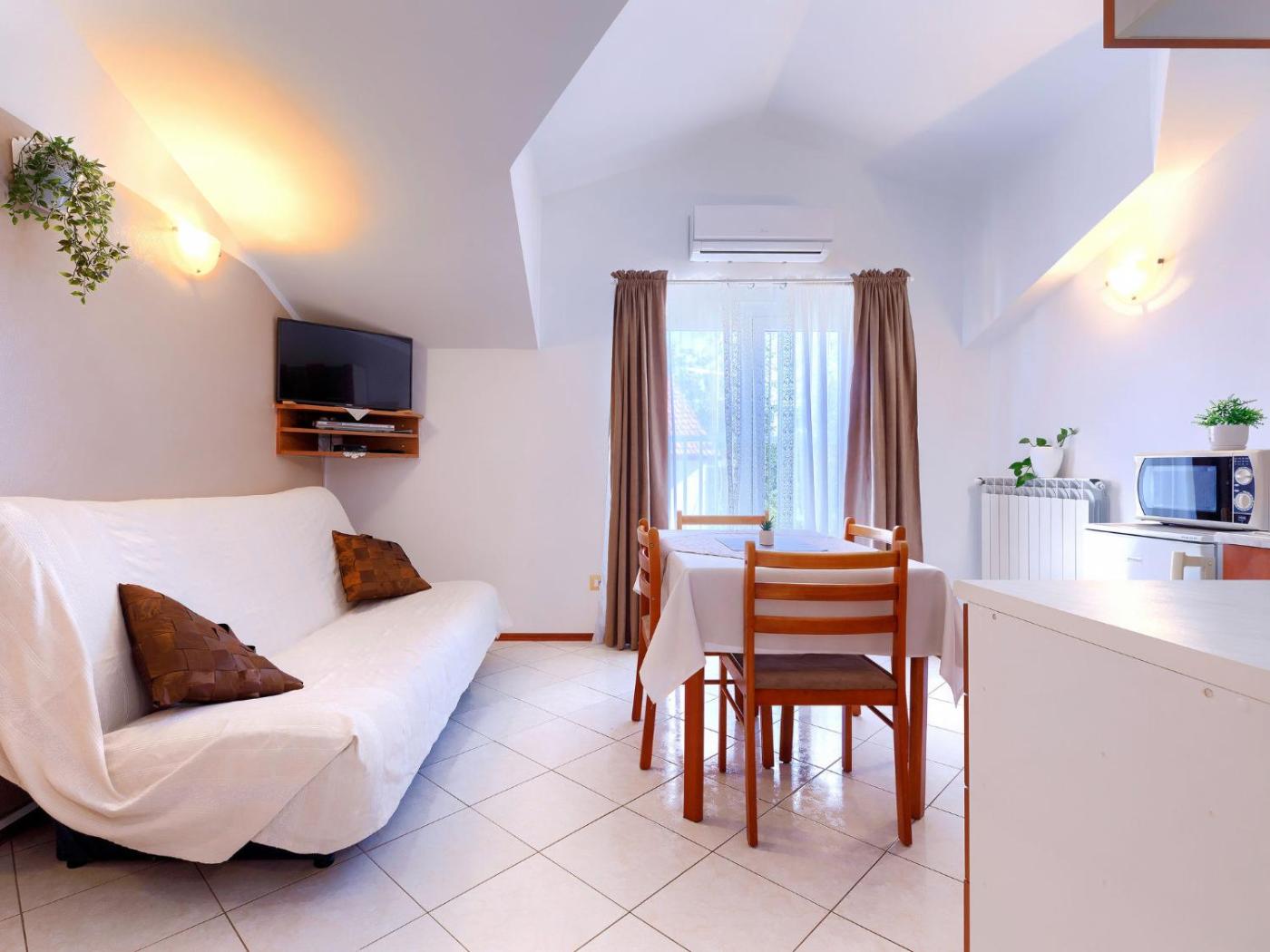 Apartment. This air-conditioned apartment comprises 1 living room, 1 separate bedroom and 1 bathroom with a shower. Guests can make meals in the kitchen that comes with a stovetop, a refrigerator, kitchenware and a microwave. This apartment features a coffee machine, a dining area and a TV with satellite channels. The unit offers 2 beds.